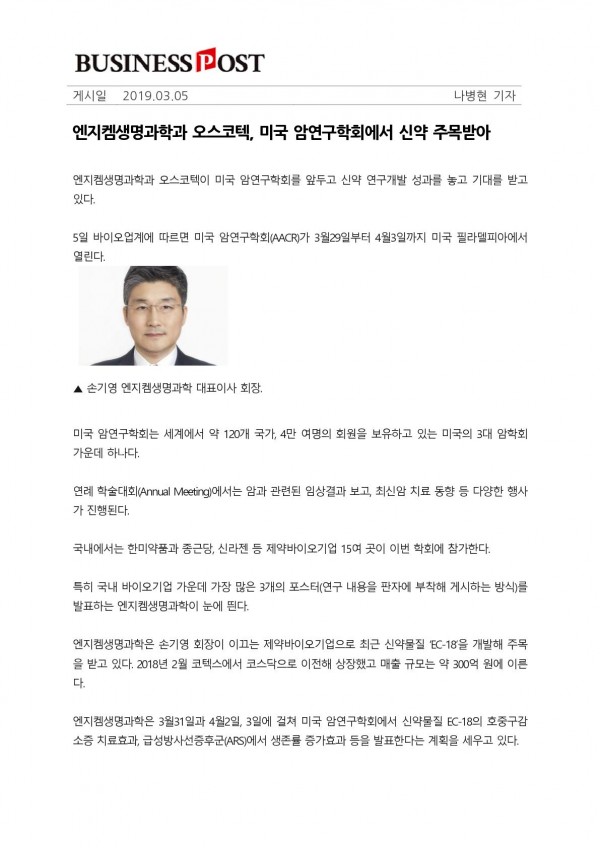 엔지켐생명과학 미국 암연구학회에서 신약 주목받아 > 언론보도