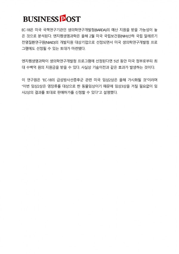 엔지켐생명과학, 호중구감소증 치료신약 임상 순항해 성장성 부각 > 언론보도