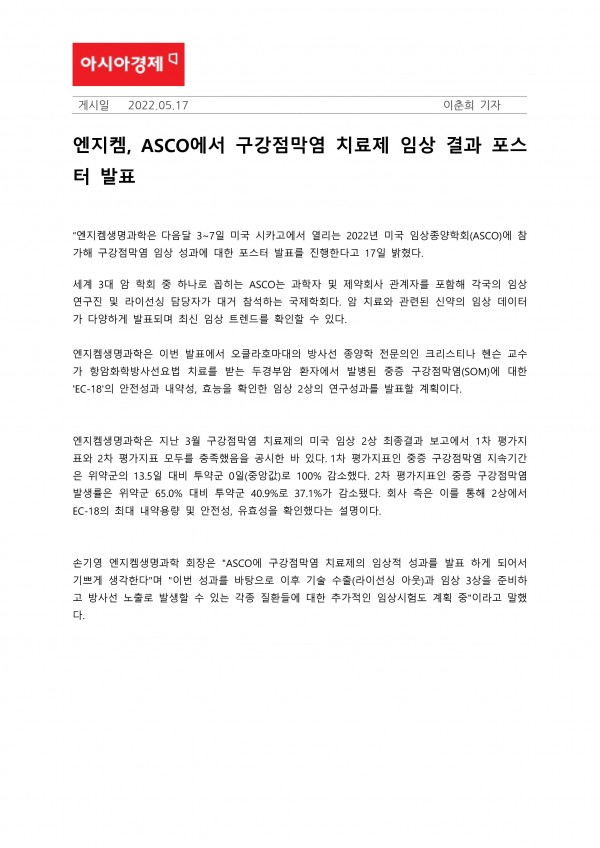 엔지켐, ASCO에서 구강점막염 치료제 임상 결과 포스터 발표 > 언론보도